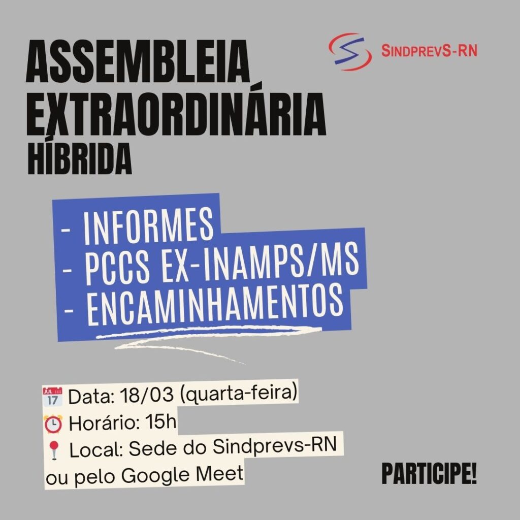 O Sindprevs-RN convoca os servidores da base para uma assembleia extraordinária híbrida, que será realizada na próxima quarta-feira, 18 de março, às 15h.